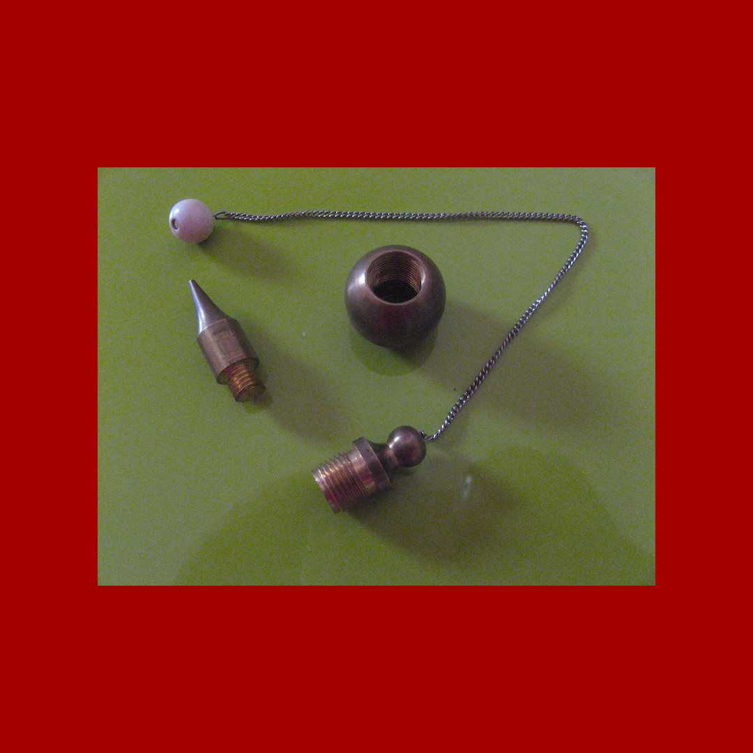 Image : Un pendule à trois pièces ; dans la pièce raccordée au fil on peut mettre un échantillon ; la boule vissable permet d’avoir un pendule plus lourd