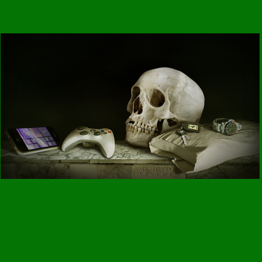 La chose importante à y voir se situe tout en bas : ce sont deux mots « Memento vivere » « pense à vivre » qui est mis à la place de « Memento mori » « Rappelle toi que tu vas mourir« .