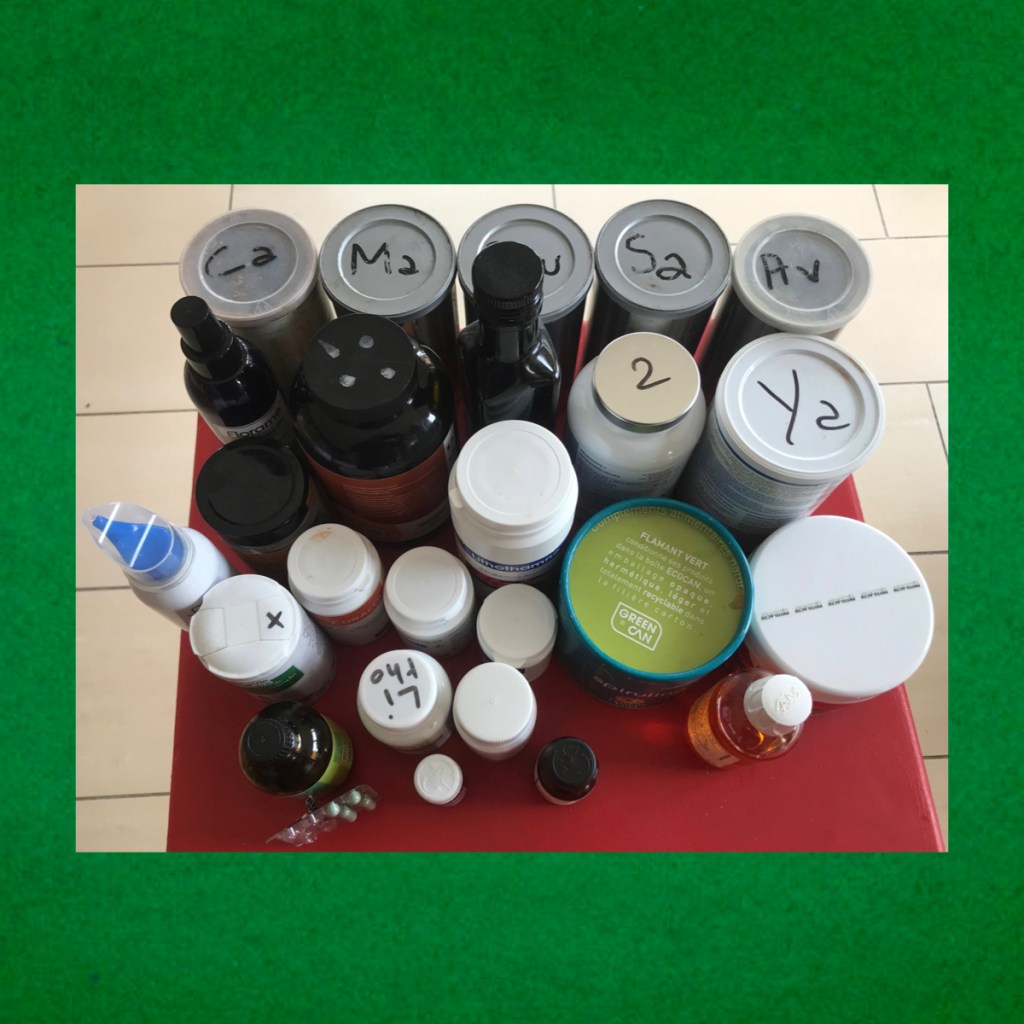 Deviner le contenu des petite bouteilles – huiles essentielles – des grandes bouteilles – eaux florales – des moyennes bouteilles – huiles et élixirs -, de la boite verte et + si perspicacité.