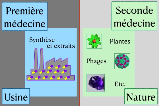 Illustration : A gauche, la Première médecine et ses 151 médicaments efficaces, à droite la Seconde médecine et ses 12 … Plus