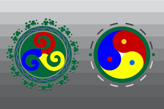 Illustration : à gauche le triskel dont les premières représentations ont 6 mille ans.A droite, le ternaire Yin Yang Yuan.…